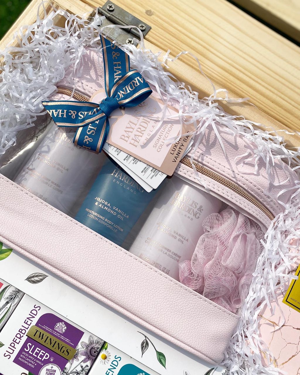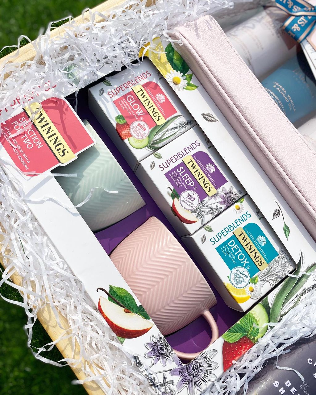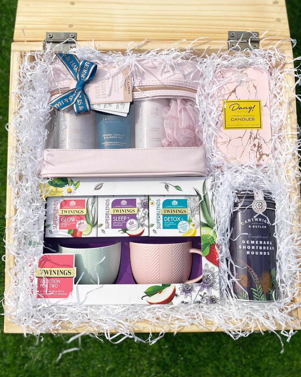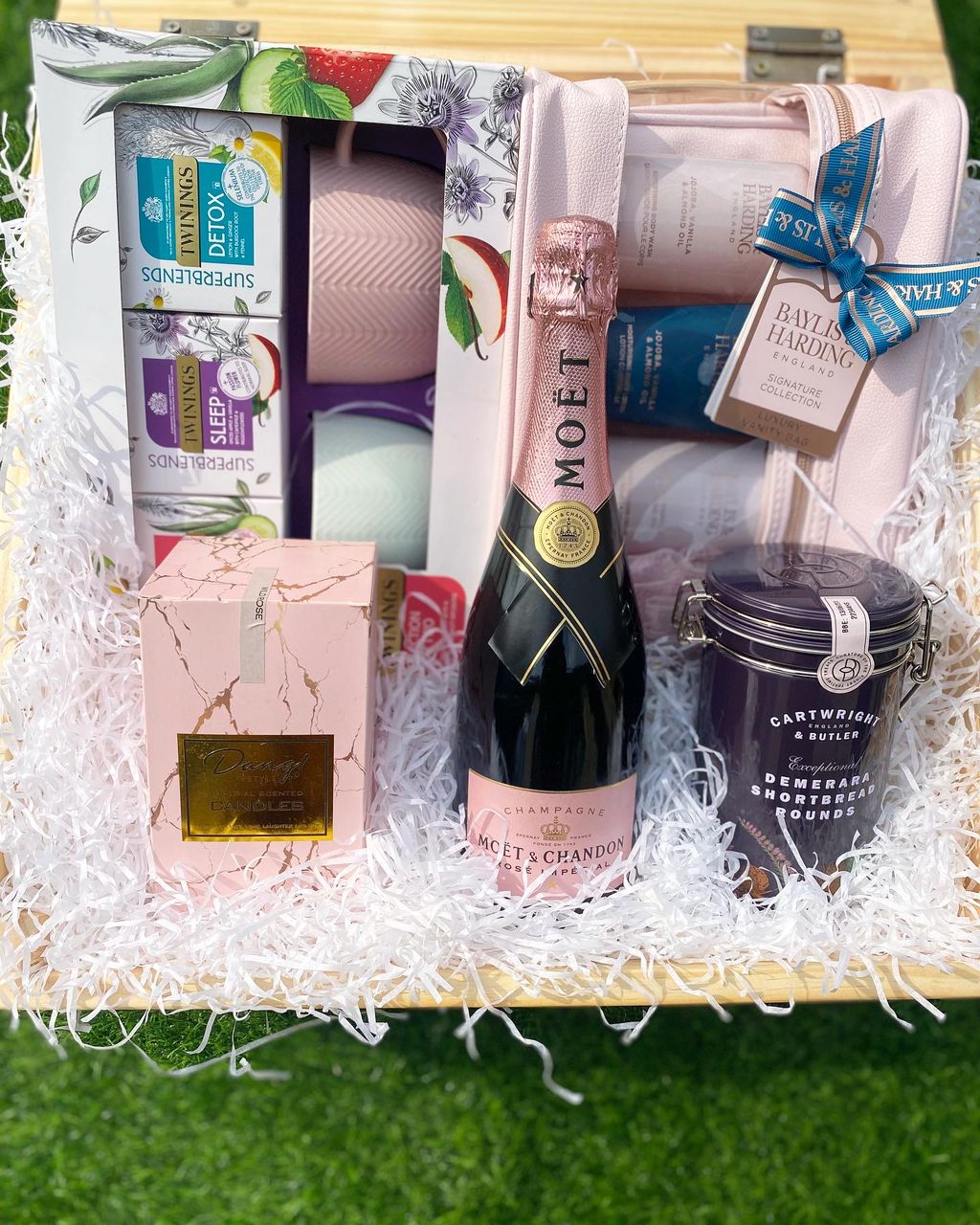 Inside, she’ll discover the soothing bliss of a Baylis & Harding Luxury Spa Kit, the comfort of a Twinings Premium Tea and Mugs Set, and the sparkle of a Moët & Chandon Imperial. A premium soy wax scented candle fills her space with delicate fragrance, while Cartwright & Butler’s assorted tinned cookies add that perfect touch of sweet indulgence.