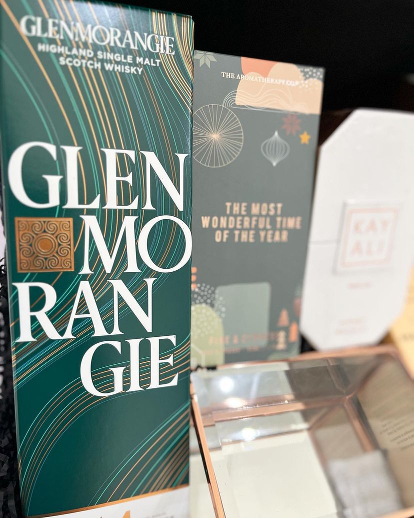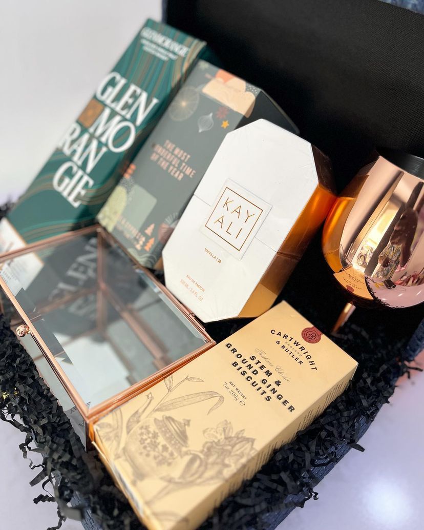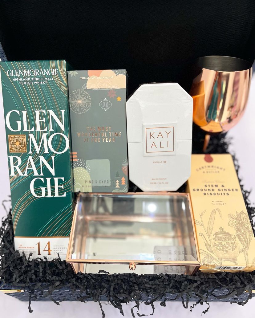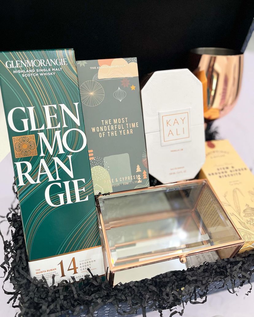 Presented in either a luxury leather box or a delicate glass trunk, this indulgent set pairs the seductive KAYALI Vanilla 28 luxury perfume with a premium glass jewelry box (or a luxury leather watch roll, depending on availability), a bottle of Glenmorangie Highland Single Malt Scotch Whisky aged 14 years, and a sleek champagne flute for toasts worthy of her presence. Completing the experience are a luxury diffuser to fill her space with understated elegance, and Cartwright & Butler’s premium cookies for a touch of sweet sophistication.